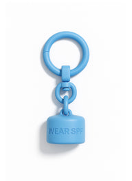 Silicone case in Darling pastel blue with mantra. Clip it anywhere to keep SHIELD-ME SPF50+ stylishly at hand.